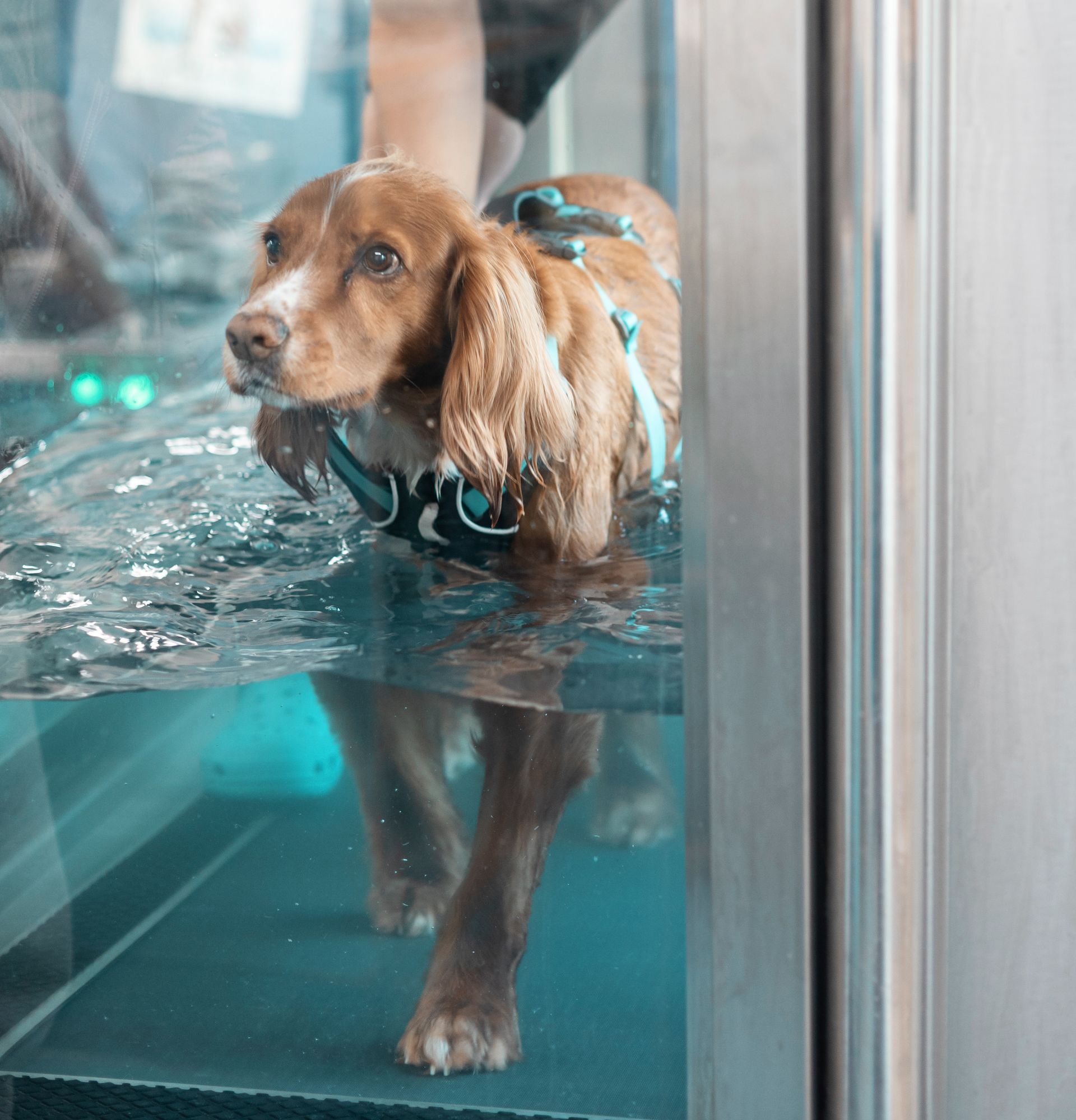 Hydrotherapy basically means healing with water. It is a non/ partially supported weight bearing exercise utilising the therapeutic properties of warm water. Swimming sessions are carried out by trained Hydrotherapists to improve a dogs fitness and function. All cases are treated differently and respond in varying degrees. For some dogs simply floating/sitting or free swimming gently in the warm water pool can relieve pain and inflammation.